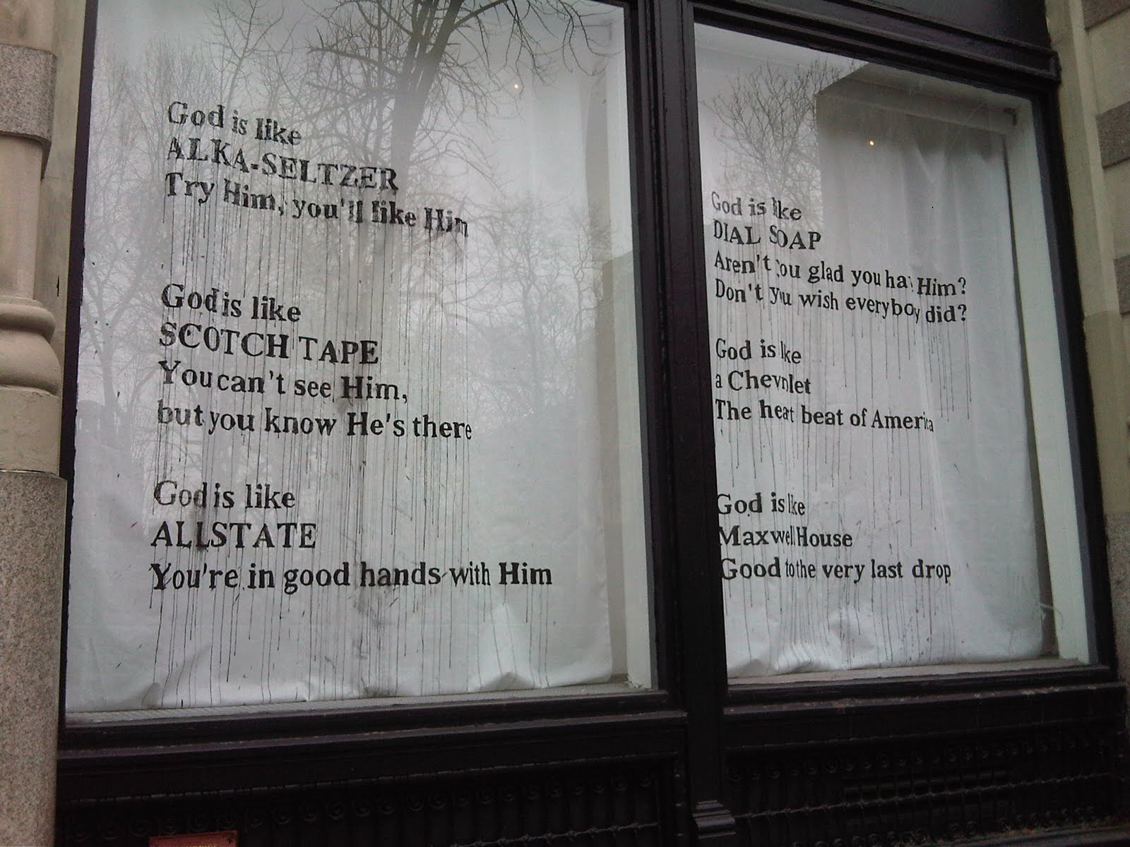 On a completely different note...As I was walking to church this morning, I passed the Steinhardt building. A new window display caught my eye, and I just had to document my findings. Even at NYU, the most secular school in the country, God's presence can be found.